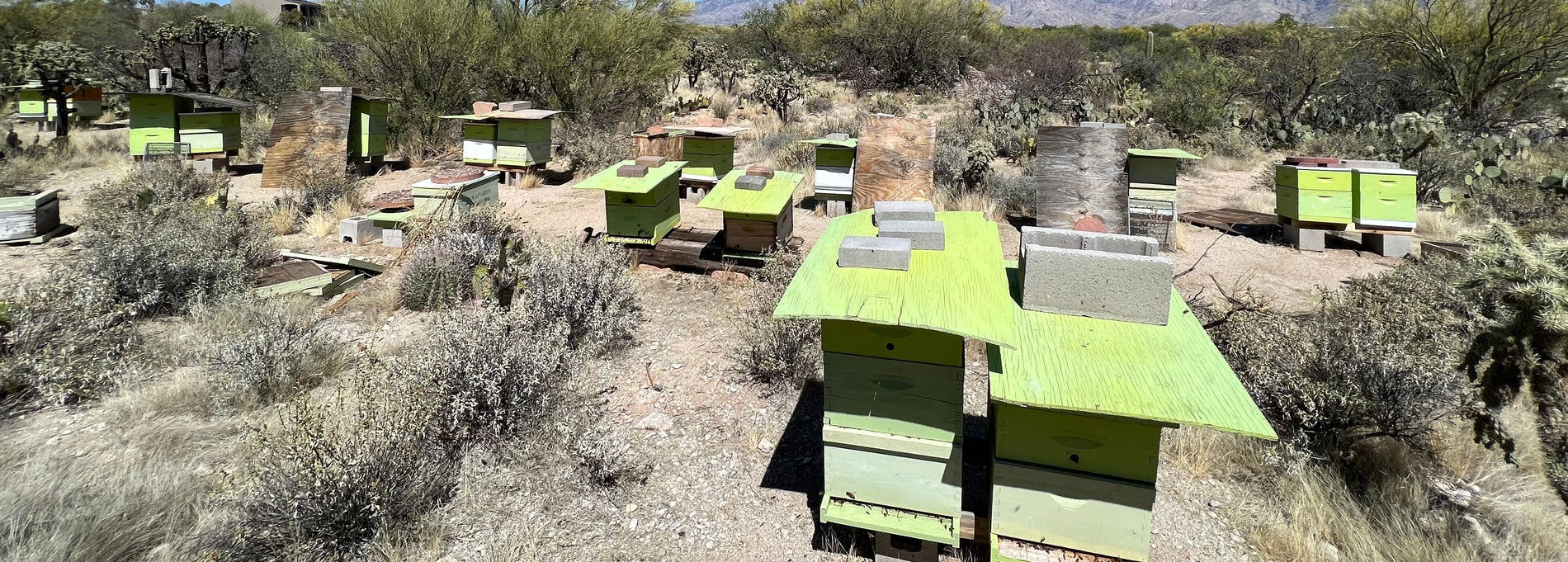 Our hives are all located in the beautiful Sonoran Desert of Southern Arizona. The main nectar flow (a time when enough plants are blooming in an area for bees to generate excess honey) occurs during late Spring and early Summer. A majority of the nectar they gather during this time is from mesquite trees.